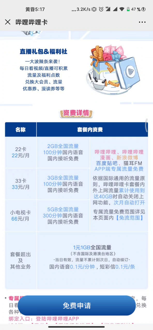 22卡的月租22块一个月,每个月2G国内流量,100分钟国内语音,bilibili视频和漫画、新浪微博、、百度贴吧、猫儿FM的App免流......