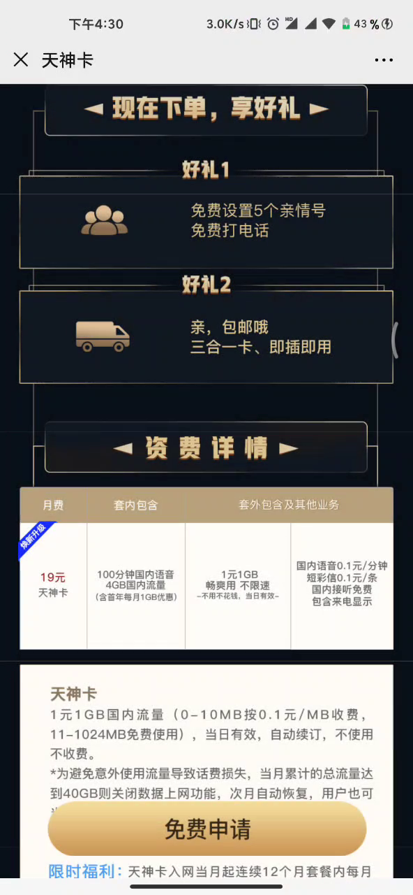 而且购买手机卡很方便,直接在线上0元购买,还包邮到家,剩下的流程就是激活使用了。
