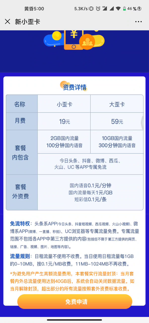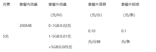 五块钱月租,200MB流量/月,比较适合老人使用,我们年轻人嘛还挺缺流量的。